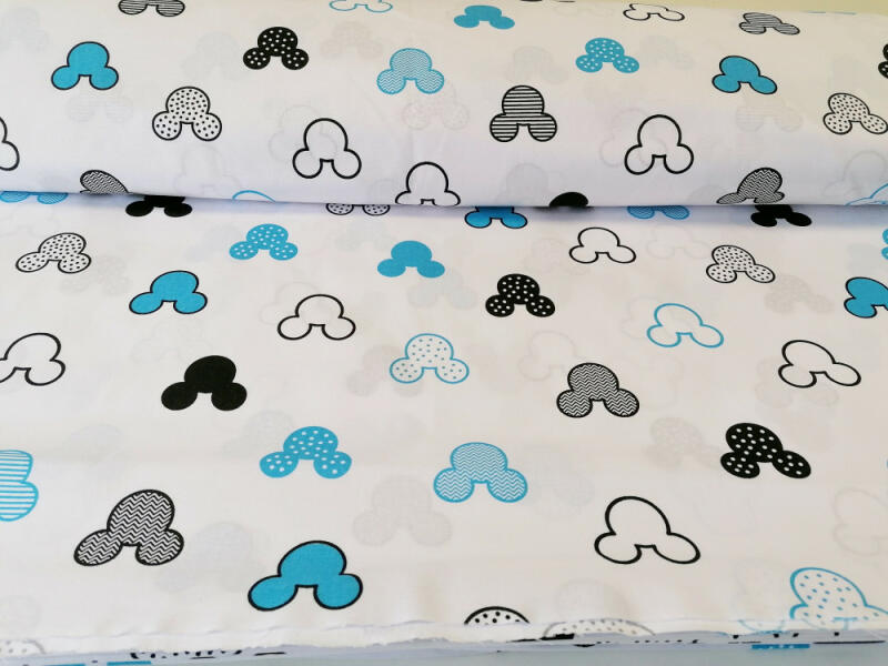 Fehér alapon kék csíkos - pöttyös egér fejes mintás pamut méteráru 160 cm széles. Készíthető belőle ágynemű huzat, paplan + párna borítás, ovis zsák, pólya, ülőpárna stb, de ideális kreatív célokra is. Az ára 1 m-re vonatkozik, minimum 1 m vásárolható, felette 10 cm-enként növelhető a kívánt mennyiségig! (1m 10 cm, 1 m 20 cm, 2 m 40 cm stb) Fehér alapon kék c