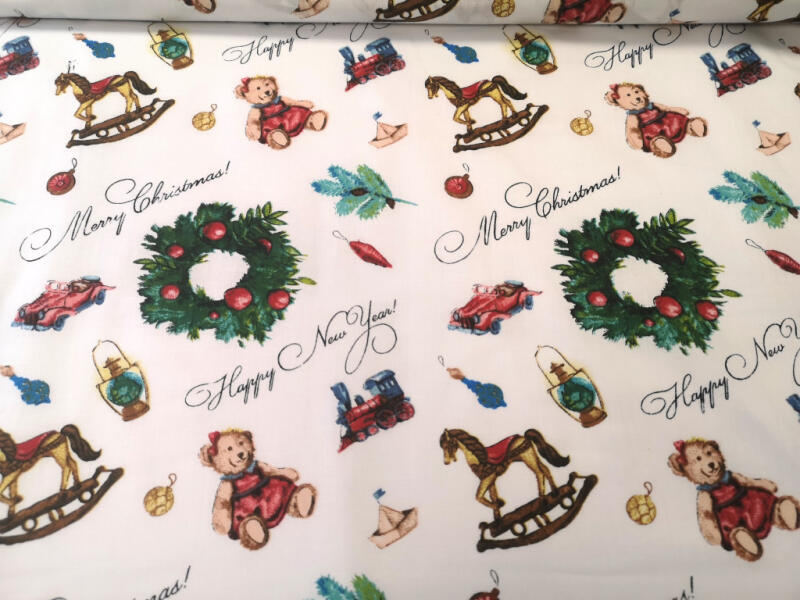 Fehér alapon színes hintaló - koszorú mintás karácsonyi pamutvászon méteráru felirattal. 100% pamut alapanyagból készült kellemes tapintású, jó nedvszívó képességű anyag. Kiváló alapanyag ágynemű huzatnak, díszpárnának, abrosznak, szivacs behúzására, dekor - térelválasztó függönynek, táskának, illetve egyéb lakásdekorációnak, valamint számos kézműves ter