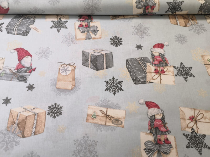 Kislány - karácsonyi ajándékcsomag mintás pamutvászon méteráru halványszürke színű alapon 100% pamut alapanyagból készült kellemes tapintású, jó nedvszívó képességű anyag. Kiváló alapanyag ágynemű huzatnak, díszpárnának, abrosznak, szivacs behúzására, dekor - térelválasztó függönynek, táskának, illetve egyéb lakásdekorációnak, valamint számos kézműves