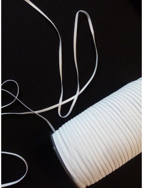 5 mm széles, fehér színű, lapos, puha, textil hatású gumipertli. Elsősorban maszkokhoz, de jelmezekhez, álarcokhoz, nyári ruhák begumizásához, kabátok, pulóverek, pizsamák aljába, ujjába is megfelelő választás. A mennyiséget kérjük centiméterben megadni. Pl. : ha 2,6 méter akkor 260 (centiméter).