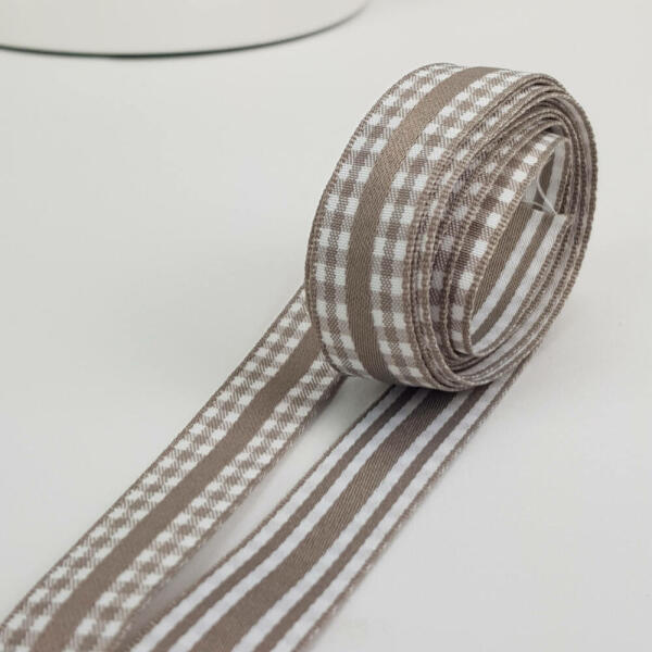 Textil szalag díszítésekhez, díszcsomagoláshoz, asztal- és ajtódíszekhez, kreatív alkotásokhoz. Kétoldalú minta! Külső oldala kockás, belső csíkos.