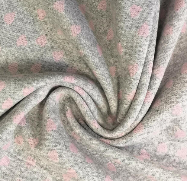 Kötött - hurkolt textil rózsaszín - szürke szín összeállítású jacquard szív motívummal. Puha, szép esésű, anyag, a belőle készült ruhadarab nagyon kényelmes viseletet. Gyermekruha, pulóver, tunika, készítéséhez ajánljuk, más textillel kombinálva is tökéletes. Anyaga: 50% polyester - 45% pamut - 5% elastan 160 cm széles Mosás: 30 °C. Az ára 1 m-re vonatkozik, minim