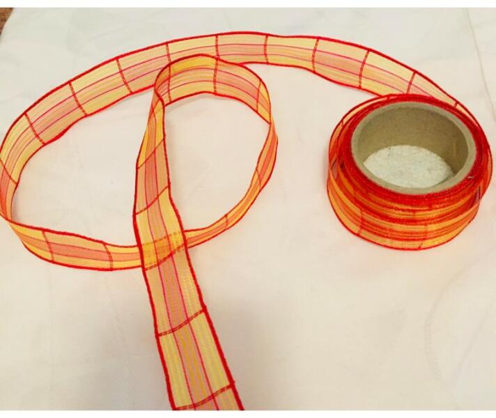 Organza szalag, drótos szélű, sárga-piros mintás. Szélessége: 2,5 cm. A mennyiséget kérjük centiméterben megadni. Pl. : ha 2,6 méter akkor 260 (centiméter)