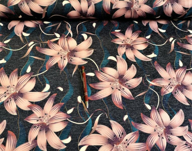 Elasztikus, puha jacquard textil, farmerkék alapon nagy liliom motívumokkal. Az anyag kényelmes viseletet biztosít, nem gyűrődik. Elsősorban tunikák, egész ruhák készítéséhez ajánljuk. Összetétele : 55% pamut, 40% poliészter, 5% elasztán. Szélessége : 145 cm Mosás : 40°C-on, vasalást nem igényel. Az ára 1 m-re vonatkozik, minimum 1 m vásárolható, felette 10 cm-enként