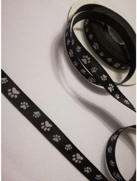 1 cm széles, fekete alapon fehér tappancsos, bordás ripsz szalag. A mennyiséget kérjük centiméterben megadni. Pl. : ha 2,6 méter akkor 260 (centiméter).