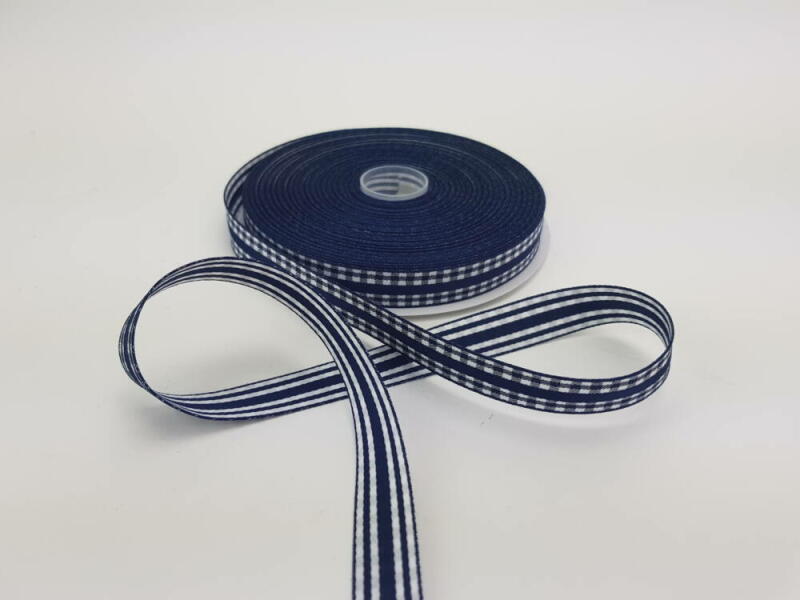 Textil szalag tekercsben. Díszcsomagoláshoz, asztal és ajtódíszekhez, kreatív alkotásokhoz. Kétoldalú! Külső oldala kockás, belső csíkos. Hossz. : 22.5 méter~