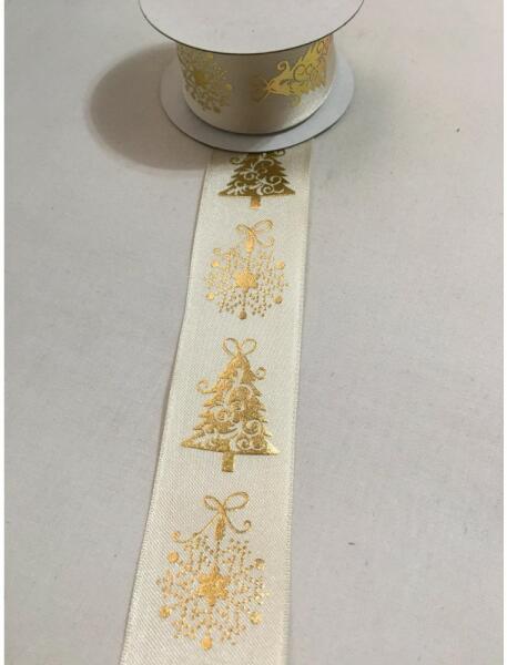 3,8 cm széles, világos bézs alapon, arany karácsonyi dísz és karácsonyfa mintás ünnepi szalag, drótos szegéllyel. A mennyiséget kérjük centiméterben megadni. Pl. : ha 2,6 méter akkor 260 (centiméter).