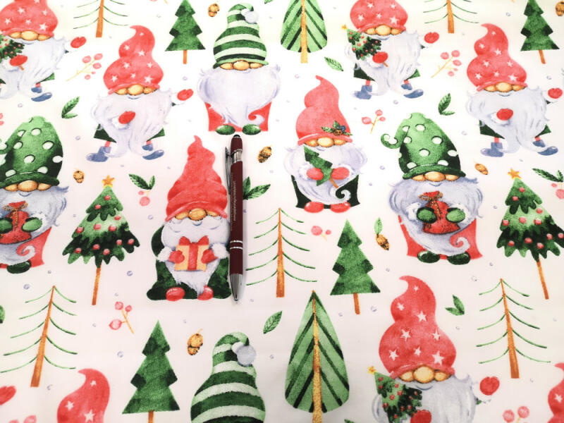 Cuki színes manós karácsonyi pamutvászon méteráru. 100% pamut alapanyagból készült kellemes tapintású, jó nedvszívó képességű anyag. Kiváló alapanyag ágynemű huzatnak, díszpárnának, abrosznak, szivacs behúzására, dekor - térelválasztó függönynek, táskának, illetve egyéb lakásdekorációnak, valamint számos kézműves termék is készül belőle. Anyagszélessé