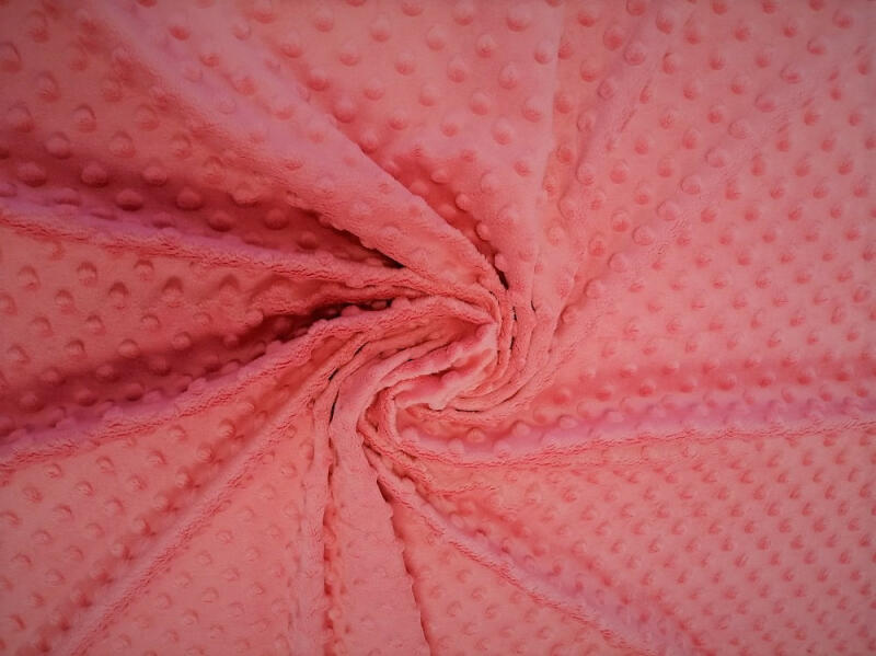 Pihe -puha dombornyomott Minky - világos lazac színben. Minky textil - méteráru 160 cm széles. Anyaga: 100% puha minky polyester, súlya 340g/m2 Kiválóan alkalmas köntösnek, plédnek, gyermek takarónak. Pamutvászonnal vagy rugalmas pamuttal kombinálva igazán könnyű puha takarók készülhetnek belőle. Mosás: 30 fokon Az ára 1 méterre vonatkozik, minimum 1 m vásárolható belől