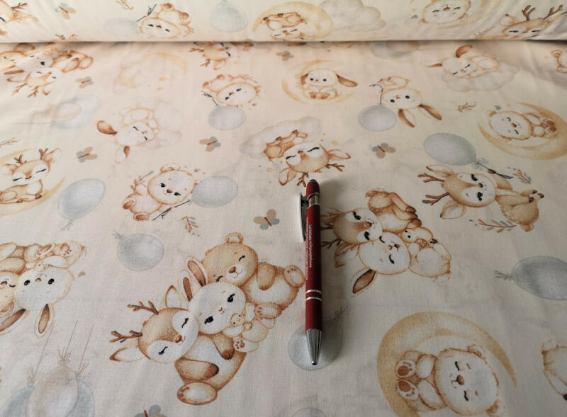Harmonikus színösszetételű pamutvászon anyag nagyon cuki állatkölyök figurákkal halványbézs alapszínen. Jó nedvszívó és légáteresztő képességű, természetes anyag, tapintása kellemes. Könnyen kezelhető, kiváló minőségű méteráru. Az anyagokat használat előtt szükséges beavatni, mert pamuttartalmuknak köszönhetően 7-10%-ot zsugorodhatnak. Szélessége: 160 cm v