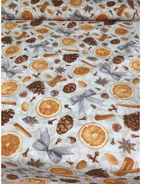 Narancsos-fahéjas-tobozos ünnepi loneta vászon A loneta egy erős, bútorvászon jellegű, len hatású, kevert szálas anyag. Elsősorban asztalterítőket készítenek belőle, de lakásdekorációs célokra (dekor sötétítő, párna és szivacs huzat) és táskáknak, szatyroknak is megfelelő választás lehet. Szélessége: 280 cm. Sűrűsége: 170 gramm/nm. Összetétel: 55% pamut, 45%