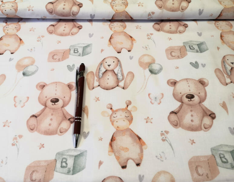 Klasszikus pamutvászon méteráru nagyon cuki maci - nyuszi pasztell menta - bézs színű mintával fehér alapszínen. Jó nedvszívó és légáteresztő képességű, természetes anyag, tapintása kellemes. Könnyen kezelhető, kiváló minőségű méteráru. Az anyagokat használat előtt szükséges beavatni, mert pamuttartalmuknak köszönhetően 7-10%-ot zsugorodhatnak. Szélessége: 16