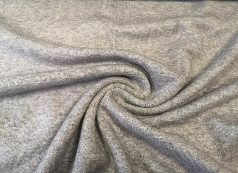 Világosszürke enyhén bolyhos felületű dupla felületű kötött - hurkolt kelme. Közepes vastagságú, puha felületű kötött anyag, amely ideális pulóver alapanyagként. A bolyhozásnak és a vastagságának köszönhetően nagyon jó hőszigetelő tulajdonságokkal rendelkezik az anyag. Kellemes tapintású, kevert szálas kelme. Szélessége: 160 cm. Összetétele: 54 % poliészter, 4