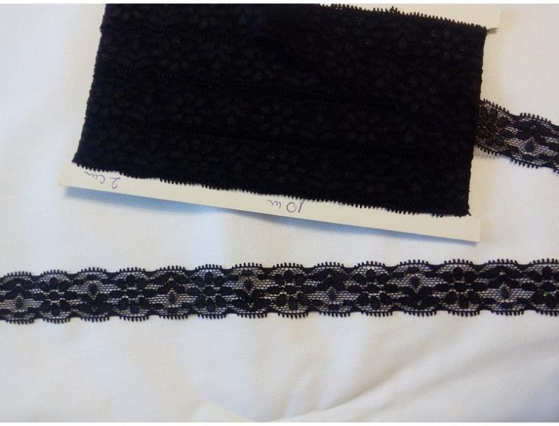 2 cm széles, fekete színű, rugalmas, nejlon csipke. A mennyiséget kérjük centiméterben megadni. Pl. : ha 2,6 méter akkor 260 (centiméter).