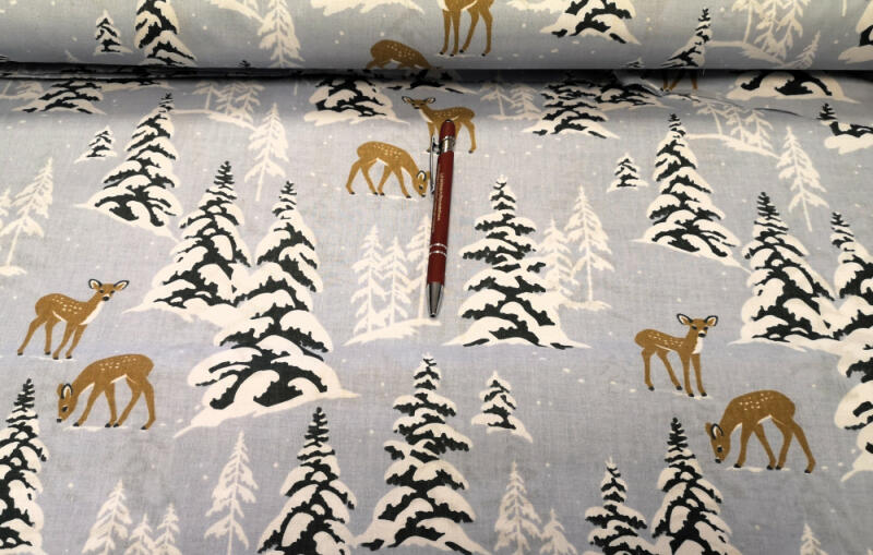 Karácsonyi téli hangulatú pamutvászon textil havas tájon aranyos őzike mintával halvány szürkéskék alapon. Kiváló minőségű termék. Kellemes fogású, jó esésű, erős anyag. Készíthető belőle terítő, függöny, székpárna, mikulás - zsák, adventi naptár, ágynemű huzat, de akár ideális dekoráció konyhaablakba is. Összetétel: 100% pamut Szélessége : 160 cm (+/-