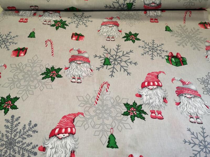 Halványszürke színű alapon hópehely - manó mintás karácsonyi méteráru. 160 cm széles. Alapanyaga: 100% pamut Készíthető belőle terítő, függöny, székpárna, mikulás - zsák, adventi naptár, ágynemű huzat, de akár ideális dekoráció konyhaablakba is. Az ára 1 m-re vonatkozik, minimum 1m vásárolható, felette 10 cm-enként növelhető a kívánt mennyiségig! Mosás 40