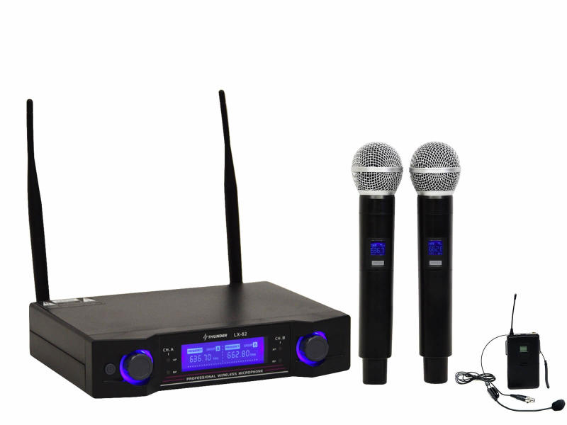 Thunder LX-82 2ND+1H UHF rádiós mikrofon (2 db KÉZI + 1 db FEJ mikrofon) Hivatalos magyarországi forgalmazótól. Leírás: A Thunder Audio LX-82 1H UHF mikrofon szett lényegében mindent tartalmaz, amihez a használat során szükségünk lehet, 2 db kézi mikrofont, 1 db fej mikrofont, 1 db vevőegységet, 1 db gyári adaptert, 1 db Jack-Jack kábelt, valamint elemeket. A vevőegység fix f