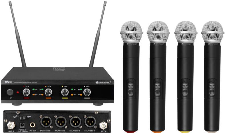 License-free 4-channel wireless microphone system 4-channel receiver and 4 hand-held microphones with UHF PLL technology Available in the license-free frequency ranges 518-534 MHz und 823-832 MHz Parallel operation of up to 12 transmission channels is possible without any interference Easy handling 4 separate channels with volume controls and LEDs for carrier signal and audio signal Balanced XLR o