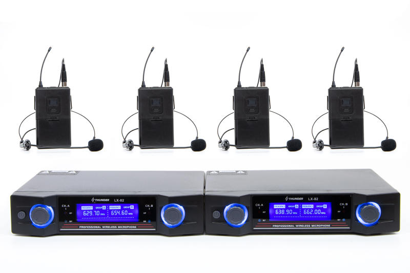 Thunder LX-82 4H UHF rádiós mikrofon (4 db FEJ mikrofon) Hivatalos magyarországi forgalmazótól. Leírás: A Thunder Audio LX-82 4H UHF mikrofon szett lényegében mindent tartalmaz, amihez a használat során szükségünk lehet, 4 db fej mikrofont, 4 db zsebadót, 2 db vevőegységet, 2 db gyári adaptert, 2 db Jack-Jack kábelt, valamint elemeket. A vevőegység fix frekvenciával rendelkez