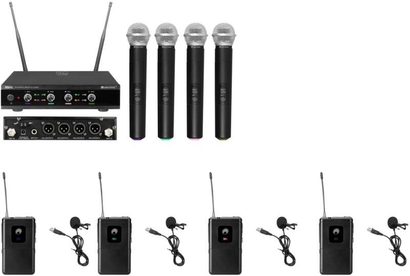 License-free 4-channel wireless microphone system OMNITRONIC UHF-E4 Wireless Mic System 823.6/826.1/828.6/831.1MHz 4- channel receiver and 4 hand-held microphones with UHF PLL technology Easy handling 4 separate channels with volume controls and LEDs for carrier signal and audio signal Balanced XLR output per channel 6.3 mm jack for mixed signal output Microphones with color indication Operating r