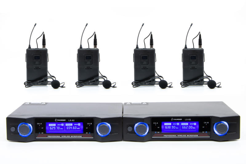Thunder LX-82 4T UHF rádiós mikrofon (4 db CSÍPTETŐS mikrofon) Hivatalos magyarországi forgalmazótól. Leírás: A Thunder Audio LX-82 4T UHF mikrofon szett lényegében mindent tartalmaz, amihez a használat során szükségünk lehet, 4 db csíptetős mikrofont, 4 db zsebadót, 2 db vevőegységet, 2 db gyári adaptert, 2 db Jack-Jack kábelt, valamint elemeket. A vevőegység fix frekvenc