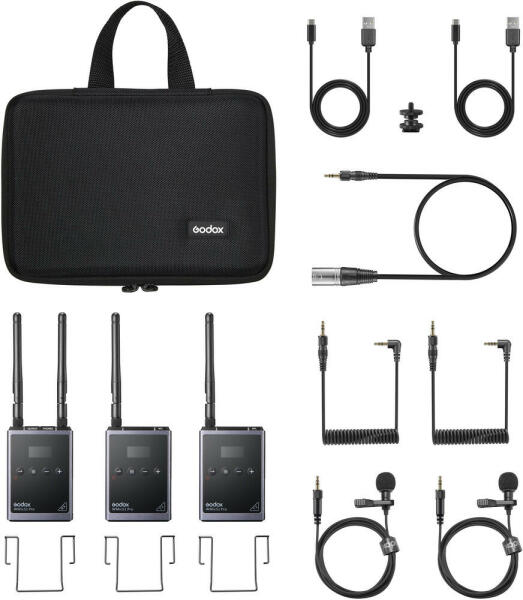 Godox TX1 adó × 2 Godox RX1 vevő x 1 Godox LMS-12B AXL mikrofon x 2 Övcsipesz Clip x 3 1x 3.5mm TRS-TRS Audio connect cable 1x XLR to 3.5mm Audio cable 1x ¼ Shoe mount Adapter 1x 3.5mm TRS-TRRS Audio connect cable 2x USB to Type-C cable 1x Hordtáska