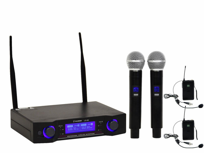 Műszaki adatok: - 2 db kézi mikrofon + 2 db fej mikrofon - Független XLR papa / MIX 6,3 mm Jack kimenet - Hatótávolság: 80 m (nyílt terepen) - Frekvencia tartomány: UHF - 6 különböző működési frekvencia: A: 624,900 és 655,100 MHz B: 629,700 és 654,600 MHz C: 632,600 és 659,100 MHz D: 636,700 és 662,800 MHz E: 638,900 és 662,000 MHz F: 659,100 és 632,600 MHz - A mikrofonok 2 x