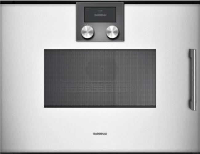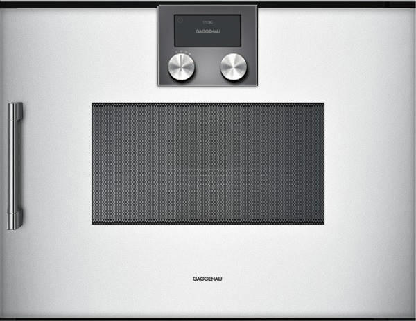 Gaggenau BMP 251 130 beépíthető kombi sütő-mikró, balos, ezüst 60 cm széles Tulajdon ságok: Süllyesztett telepítés Mikrohullámú sütő, grill és sütő egyfunkciós és kombinációja Akár 5 üzemmód szekvenciális működése, beleértve kombinált működés és pihenőidő programozása TFT érintőkijelző Panel nélküli készülék felületvezérlő modullal Mikrohul lámú