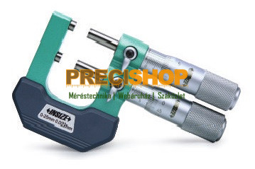 Kengyeles dupla-mikrométer, analóg. Méréstartomány: 0-25mm Felbontás: 0.002mm, Állítható villás idomszerként használható, megy / nem-megy oldal, külső mérésekre, keményfém felületű mérőpofa,