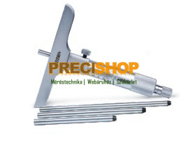 Mélységmérő-mikrométer Analóg Méréstartomány: 0-25mm Felbontás: 0,01mm Mérőhidas mikrométer, különböző hosszúságú köszörült lapos végű hosszabbítókkal szállítjuk, Mérőhíd= 101,5mm, hosszabbító pontosság: +/-(2+L/75)μm,