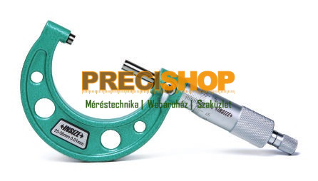 Kengyeles mikrométer, analóg. Méréstartomány: 0-25mm Felbontás: 0.01mm, Hővédős, kengyeles mikrométer analóg, külső mérésekre, keményfém felületű mérőpofa, beállító etalonnal 25mm felett, DIN 863