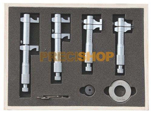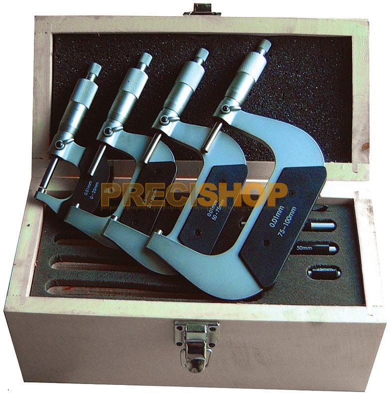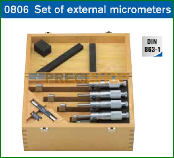 Racsnival, rögzítő füllel, keményfém mérőfelületek, acél kengyel szigetelő bevonattal. Skála: krómozott. Megfelel DIN863-1 követelményeinek. Fa dobozban szállítjuk. A készlet tartalma: 4db kengyeles nikrométer: 0-25mm, 25-50mm, 50-75mm, 75-100mm és 2db beállító etalon: 25mm és 75mm