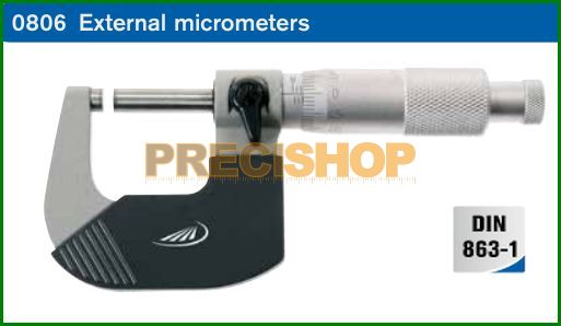 Racsnival, rögzítő füllel, keményfém mérőfelületek, acél kengyel szigetelő bevonattal. Skála: krómozott. Megfelel DIN863-1 követelményeinek. Beállító etalonnal (25mm), műanyag dobozban szállítjuk.