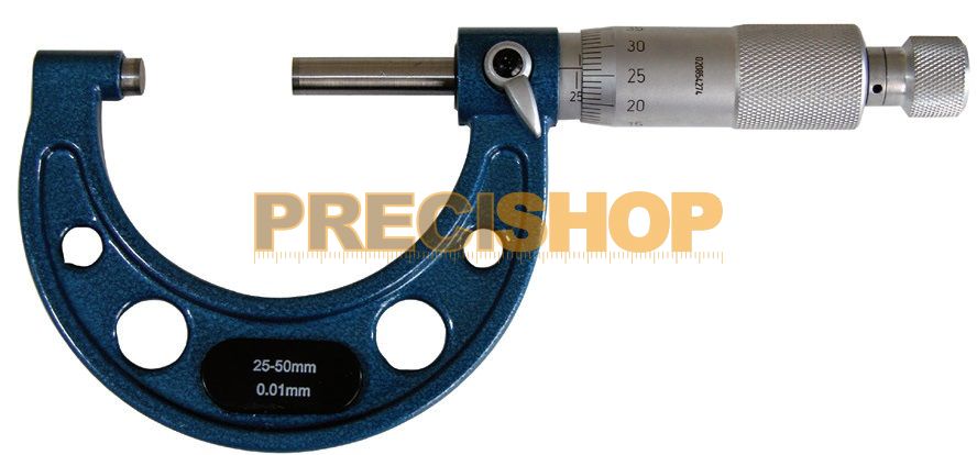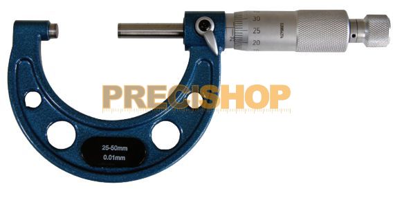 Méréstartomány 25 - 50 mm,Mérőorsó 6,5 mm, Orsóemelkedés 0,5 mm, Leolvasás 0,01 mm, Lakkozott, keményfém mérőfelület, Racsnival