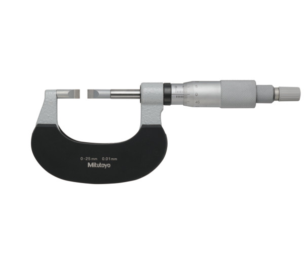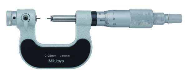 Pengés mikrométer a nehezen mérhető helyek könyebb megközelítésére. Jellemzői: Kis mérőfelülettel Külső hornyok méréséhez. Nem-forgó orsó. Tartomány: 0 - 25 mm Maximum Permissible Error J MPE: ±3 µm Ülék/Csúcs: Type D, carbide t=0.4 mm Tömeg: 275 g Mérési felület: Carbide-tipped or hardened steel spindle and anvil Mérőorsó: ø 6,35 mm, spindle pitch 0.5