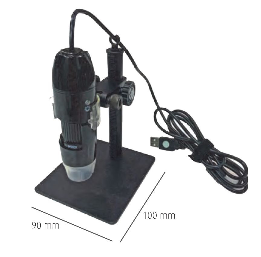 Ipari ellenőrzésre alkalmas,CMOS színes kamera,Felbontás: 300.000 Pixel (640 x 480) Látómező: 38x29mm -1,9x 1,45mm,Nagyítási tényező: 10-500,Állítható LED világítással,Windows-PC és MAC kompatibilis,Szerkesztő szoftverrel (mérés, mentés, képátvitel), szállítási terjedelem: A mikroszkóp állvánnyal,Kalibrációs vonalzó,USB kábel,Rögzítő fedél,Koffer