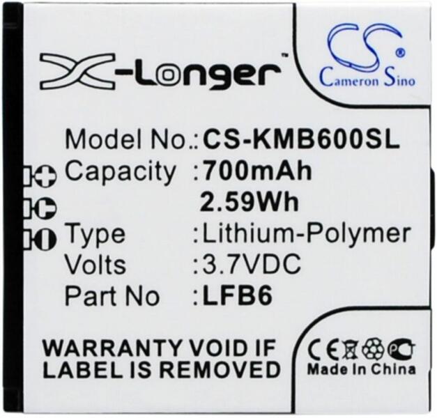 Akkumulátor Cameron Sino CS-KMB600SL Kompatibilitás: Kazam Life B6EAN: 4894128099352 Feszültség: 3.70 V Típus: Li-Ion Kapacitás: 700 mAh Energia: 2.59 Wh Magasság: 44 mm Szélesség: 41 mm Mélység: 4 mm Súly csomagolás nélkül: 14 g Súly csomagolással együtt: 39 g