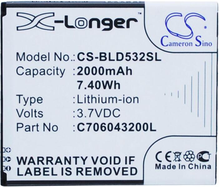 Akkumulátor Cameron Sino CS-BLD532SL Kompatibilitás: Blu D532 Blu D532u Blu D534 Blu D670 Blu D670u Blu L120 Blu L131l Blu L131u Blu Life One Blu Life One M Blu Studio 5.0 Ii Blu Studio 5.0c Hd Blu Studio 5.0c Mini Blu Studio C Mini Blu Studio C Mini 5.0EAN: 4894128106050 Feszültség: 3.70 V Típus: Li-Ion Kapacitás: 2000 mAh Energia: 7.40 Wh Magasság: 70 mm Szélesség: 60 mm Mélység: 4 mm