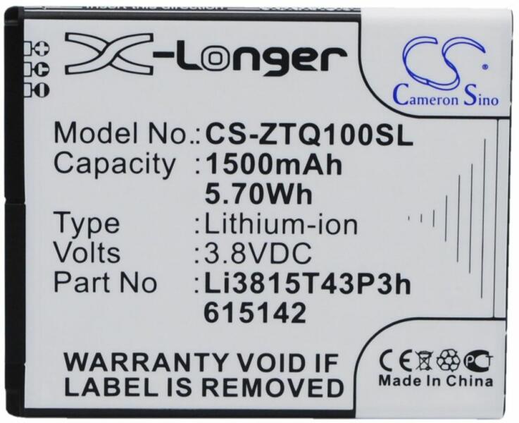 Akkumulátor Cameron Sino CS-ZTQ100SL Kompatibilitás: Zte Blade Q Mini Zte Ntzez667g3p4p Zte Prelude 2 Zte Whirl 2 Zte Whirl Ii Zte Z667 Zte Z667g Zte Z667t Zte Zinger Amazing A4cEAN: 4894128087977 Feszültség: 3.80 V Típus: Li-Ion Kapacitás: 1500 mAh Energia: 5.70 Wh Magasság: 61 mm Szélesség: 50 mm Mélység: 4 mm Súly csomagolás nélkül: 28 g Súly csomagolással együtt: 53 g