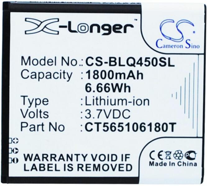 Akkumulátor Cameron Sino CS-BLQ450SL Kompatibilitás: Blu Quattro 4.5EAN: 4894128108009 Feszültség: 3.70 V Típus: Li-Ion Kapacitás: 1800 mAh Energia: 6.66 Wh Magasság: 57 mm Szélesség: 51 mm Mélység: 6 mm Súly csomagolás nélkül: 37 g Súly csomagolással együtt: 62 g