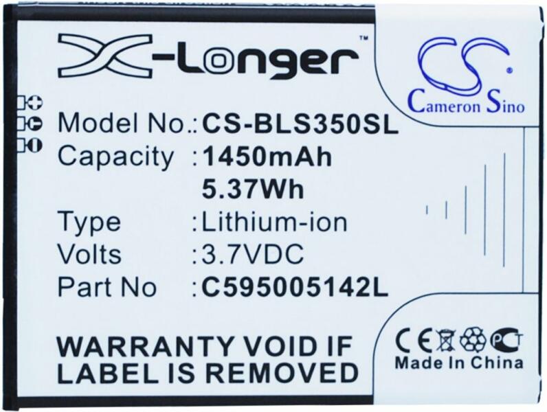 Akkumulátor Cameron Sino CS-BLS350SL Kompatibilitás: Blu S350 Blu Star JrEAN: 4894128106012 Feszültség: 3.70 V Típus: Li-Ion Kapacitás: 1450 mAh Energia: 5.37 Wh Magasság: 65 mm Szélesség: 50 mm Mélység: 4 mm Súly csomagolás nélkül: 32 g Súly csomagolással együtt: 57 g