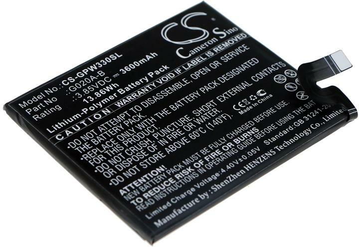 Akkumulátor Cameron Sino CS-GPW330SL Kompatibilitás: Google G020c Google Pixel 3a XlEAN: 4894128149712 Feszültség: 3.85 V Típus: Li-Polymer Kapacitás: 3600 mAh Energia: 13.86 Wh Magasság: 75 mm Szélesség: 64 mm Mélység: 5 mm Súly csomagolás nélkül: 52 g Súly csomagolással együtt: 87 g