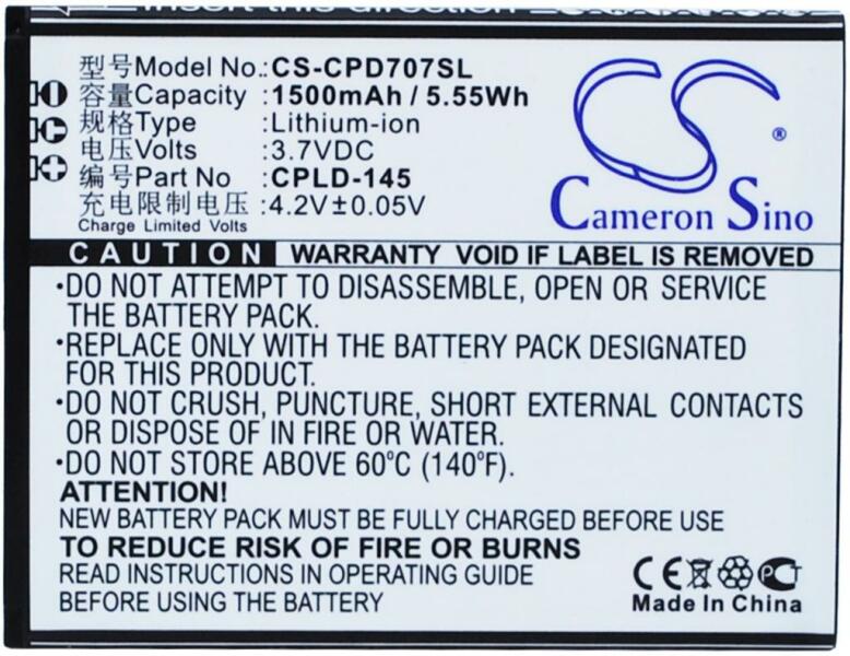 Akkumulátor Cameron Sino CS-CPD707SL Kompatibilitás: Coolpad 8707EAN: 4894128106241 Feszültség: 3.70 V Típus: Li-Ion Kapacitás: 1500 mAh Energia: 5.55 Wh Magasság: 68 mm Szélesség: 52 mm Mélység: 5 mm Súly csomagolás nélkül: 30 g Súly csomagolással együtt: 55 g
