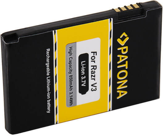 PATONA Akkumulátor f. Motorola Razr V3 Lifestyle 285 Razr V3 Pebl U6 Razr V3 Prolife PATONA Akkumulátor f. Motorola Razr V3 Lifestyle 285 Razr V3 Pebl U6 Razr V3 Prolife Műszaki adatok: Kapacitás: 850mAh Típus: Li-Ion Kompatibilis modellszám: Motorola Lifestyle 285 Pebl U6 Prolife 300, 500 Razr V3, V3C, V3i, V3ie, V3M, V3XX Flip P, RAZR Kompatibilis cikkszámok: Moto rola BR50, SNN5696, SNN5