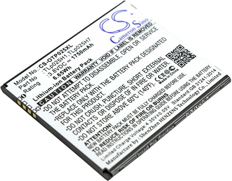 Akkumulátor Cameron Sino CS-OTP025XL Kompatibilitás: Alcatel One Touch Pop 4 Alcatel One Touch Pop 4 Lte Alcatel Ot-5051 Alcatel Ot-5051d Alcatel Ot-5051xEAN: 4894128128946 Feszültség: 3.80 V Típus: Li-Ion Kapacitás: 1750 mAh Energia: 6.65 Wh Magasság: 71 mm Szélesség: 62 mm Mélység: 4 mm Súly csomagolás nélkül: 42 g Súly csomagolással együtt: 67 g