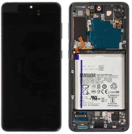Gyári Samsung Galaxy S21 5G OLED kijelző érintővel Fekete kerettel, előlap, akkumulátorral Fekete, Eredeti gyári, 1 év, Samsung, Előlap, lcd keret, Kijelző érintővel, Érintő (touch, digitizer), OLED