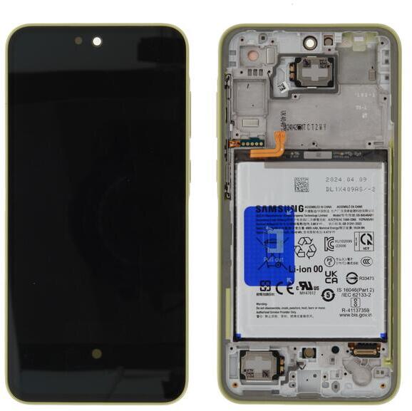 Gyári Samsung Galaxy A35 OLED kijelző érintővel Sárga kerettel, előlap, akkumulátorral (Lemon) Sárga, Eredeti gyári, 1 év, Samsung, Előlap, lcd keret, Kijelző érintővel, Érintő (touch, digitizer), OLED