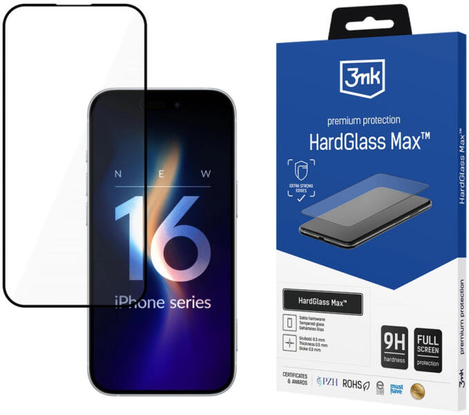 3MK HardGlass Max iPhone 16 6.1" tok, fekete, Fullscreen Glass Reinforced tempered glass covers the entire screen. HardGlass Max provides the highest possible scratch resistance. It has a hardness of 9H. Thanks to this, even sharp objects made of tool steel cease to pose a threat. High strength, finish and outstanding protective properties are due to hardening. The glass is subjected to its streng