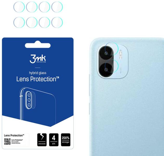 4x 3mk védőüveg a kamerára Xiaomi Redmi A1/Redmi A1 Plus telefonra - Átlátszó Edzett üveg és fólia a kamerára. Magas sdzintű védelem a karcolódás ellen: A keménysége 6H, mely hozzáadott kerámia rétegekkel erősített. A védőüveg így is vékony, nem rontja a kamera funkcióját. Lens Protection 2,5-szer emeli a kamera keménységét: Eséskor sem törik veszélyes, apró dar