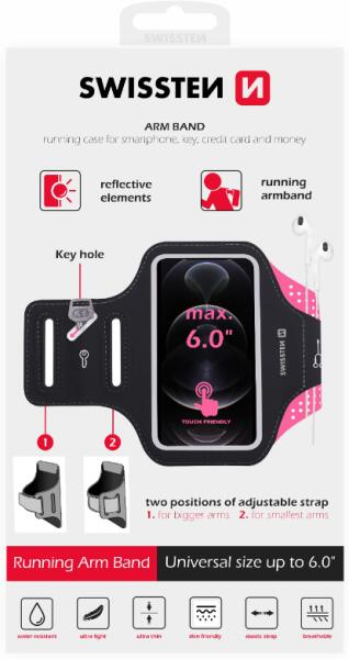 Swissten telefontartó karpánt sportoláshoz, 6.0" méret, Fekete/Rózsaszín Ez a Swissten telefontartó karpánt megoldja az összes kérdésed a személyes holmijaid tárolásával kapcsolatban sportolás közben, mert beleteheted a telefonod, bankkártyád, kulcsod, külön kivezető/elvezető rész van kialakítva a fülhallgató kábeleknek, ráadásul víz- és izzadságlepergető anyagán